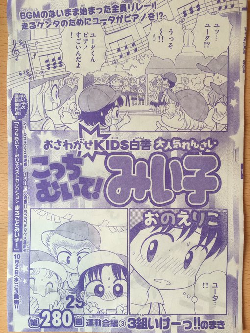 みい子と竜平のloveに注目、33巻! 読むと必ずえがおになれる 「ちゃお」1番のロングヒットシリーズ「こっちむいて! みい子」、 ついに出ます! 33巻♪ 明るくかわいいみい子は、元気いっぱいな小学6年生! 竜平(たっぺい)くんにまりちゃん、ユッコ、大好きな友だちや家族と今日もこっちむいて!みい子 34巻 重大ニュース★みい子、中学生になります! 読むと必ずえがおになれる「ちゃお」1番のロングヒットシリーズ「こっちむいて!みい子」、お待たせしました! 史上最高にメモリアルな34巻♪ 楽しかった日も、涙した日も、みんなでいっしょに過ごしてきた杉の木電子書籍版 こっちむいて!みい子 の最新刊、33巻は年03月13日に発売されました。34巻の発売予定は未定です。 34巻の発売予定は未定です。 (著者: おのえりこ )